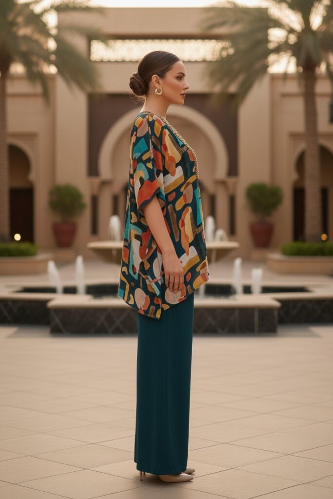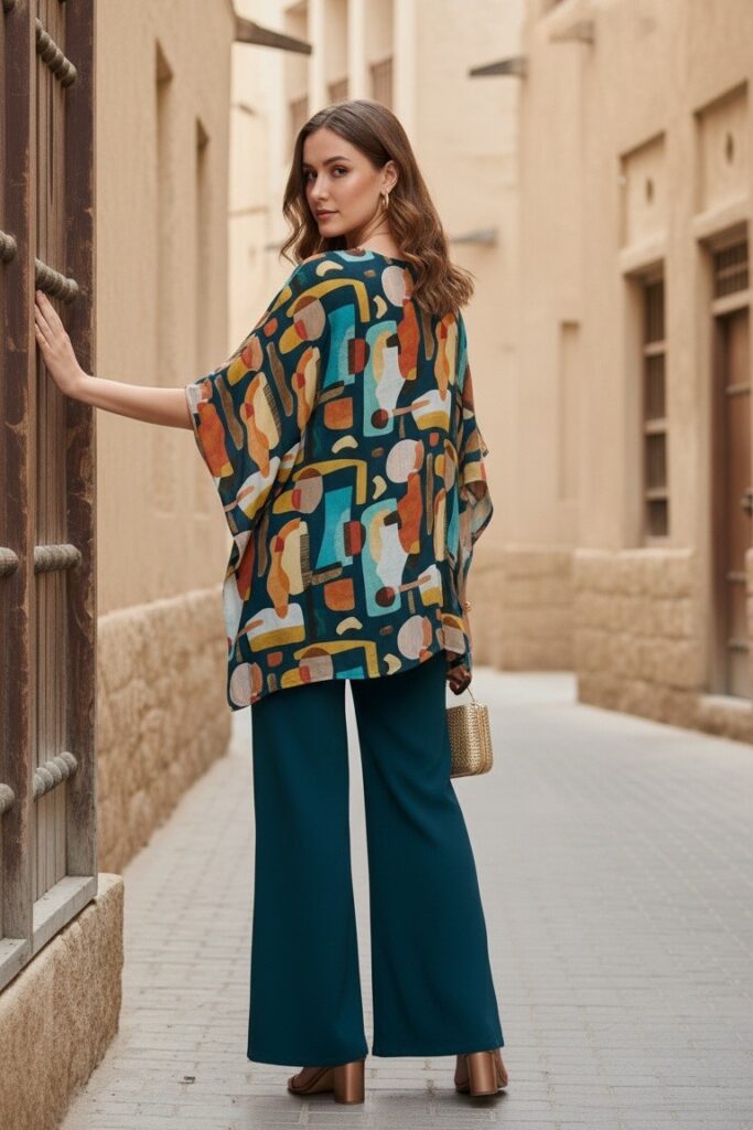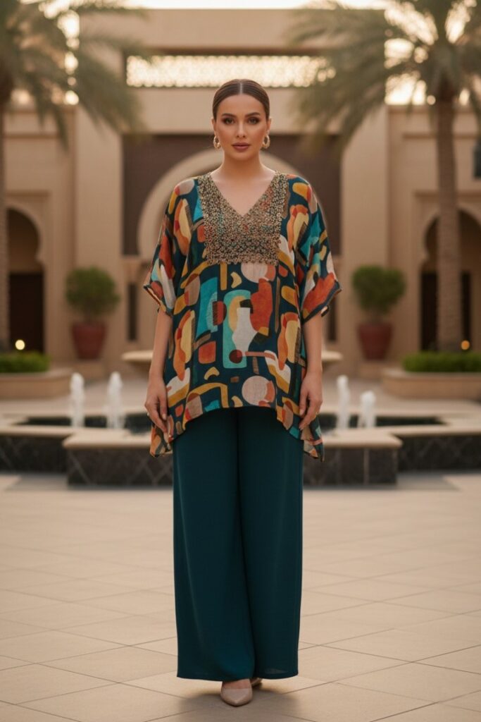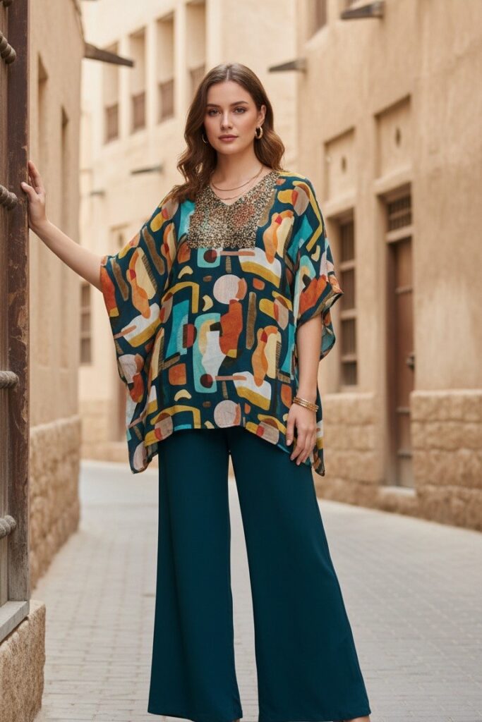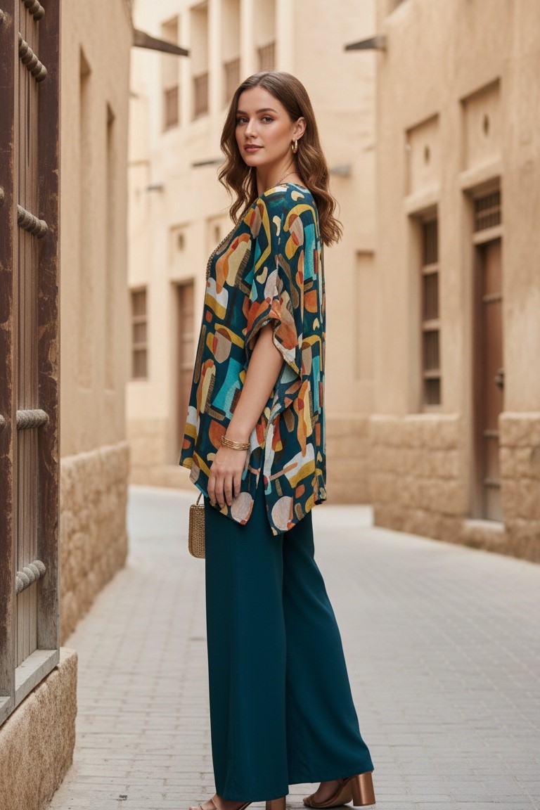 Make a statement with the Artisan Spirit set: Dive into a world of Bold color and captivating design. Our Abstract print top is wearable work of art, featuring a dynamic palette brought to life by a dazzling sequined neckline. Complimenting this show stopping piece are the fluid teal wide pants, crafted for both comfort and a striking contemporary aesthetic.