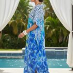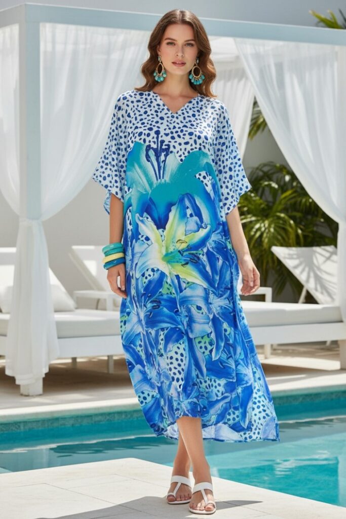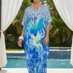 Make a stunning statement by the pool in this vibrant Aurora Bliss kaftan, it features a bold, large scale blue and lime floral print and animal print spots with rhinestones on the neckline. The light weight premium satin fabric drapes effortlessly for a look of sophisticated comfort. Ideal for beach vacation, resort lounging or a stylish pool side event.