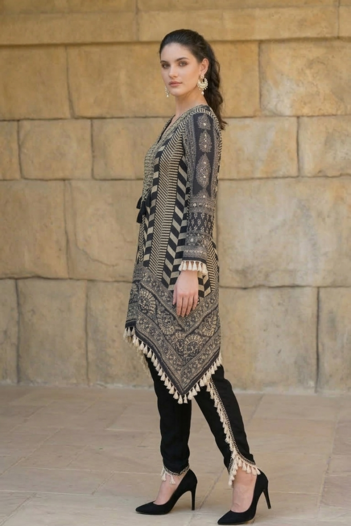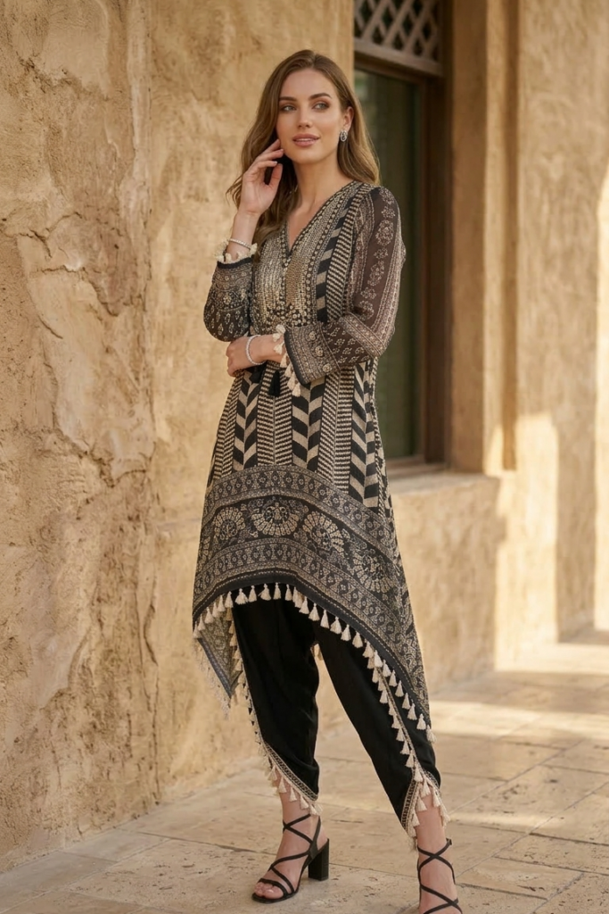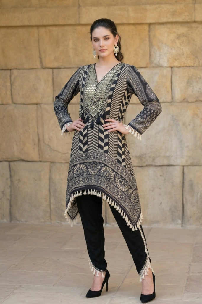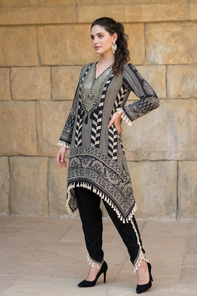 The kurta features intricate ethnic prints blended with contemporary chevron patterns, creating a statement look that is both classic and modern. The neckline has mirror and Gota embellishment the asymmetrical hemline is finished with soft tassels, adding graceful movement and a touch of boho flair.