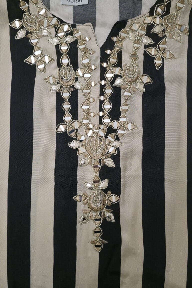 A stunning fusion of classic charm and contemporary flair. This elegant Indo-Western two-piece offers a captivating silhouette with its bold black and ivory vertical stripes, designed to elongate and flatter every figure.
