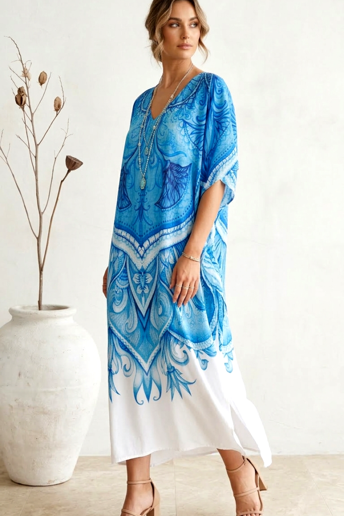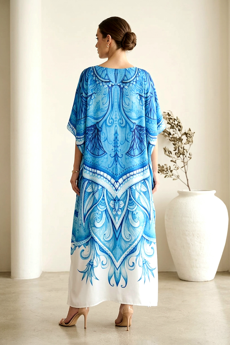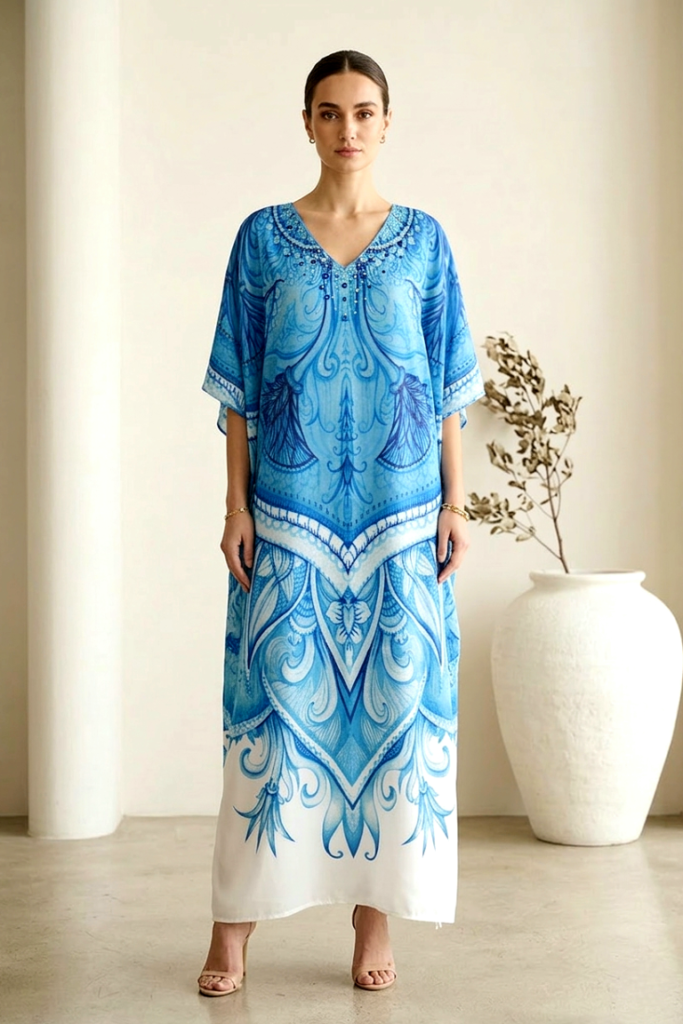 Make waves in the Ocean spell Kaftan — a true statement piece that captures the serenity of ocean tides and the elegance of intricate artistry. this digitally printed beauty features mesmerizing shades of blue with rhinestones on the neckline, layered in a detailed, almost mandala-like pattern that radiates sophistication. Lightweight and airy, it’s ideal for seaside escapes, resort lounging, or twilight strolls. Pair it with strappy sandals and pearl accents to complete your coastal goddess look.