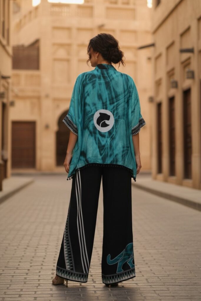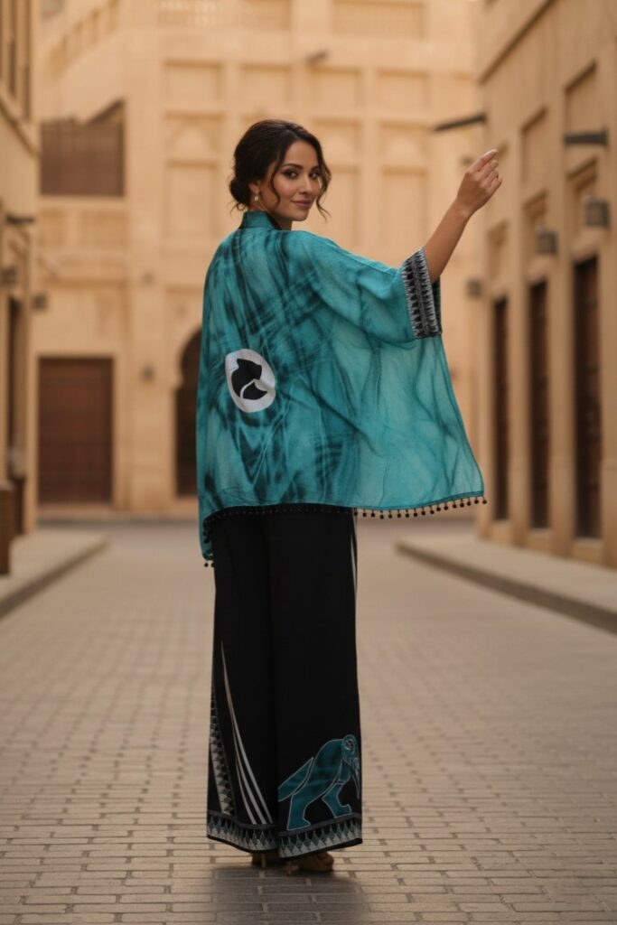 Unleash your inner power with the Panther Set, a striking fusion of art and elegance. Crafted in flowing crepe with a mesmerizing aqua-blue tie-dye effect, this co-ord features a relaxed silhouette Kaftan style top paired with wide-leg pants. The bold panther motifs symbolize confidence and strength, while the geometric borders add a touch of contemporary edge. Perfect for luxe evenings, resort brunches, or artful city strolls — this statement ensemble celebrates fearless femininity with Nurai’s signature Indo-Western flair