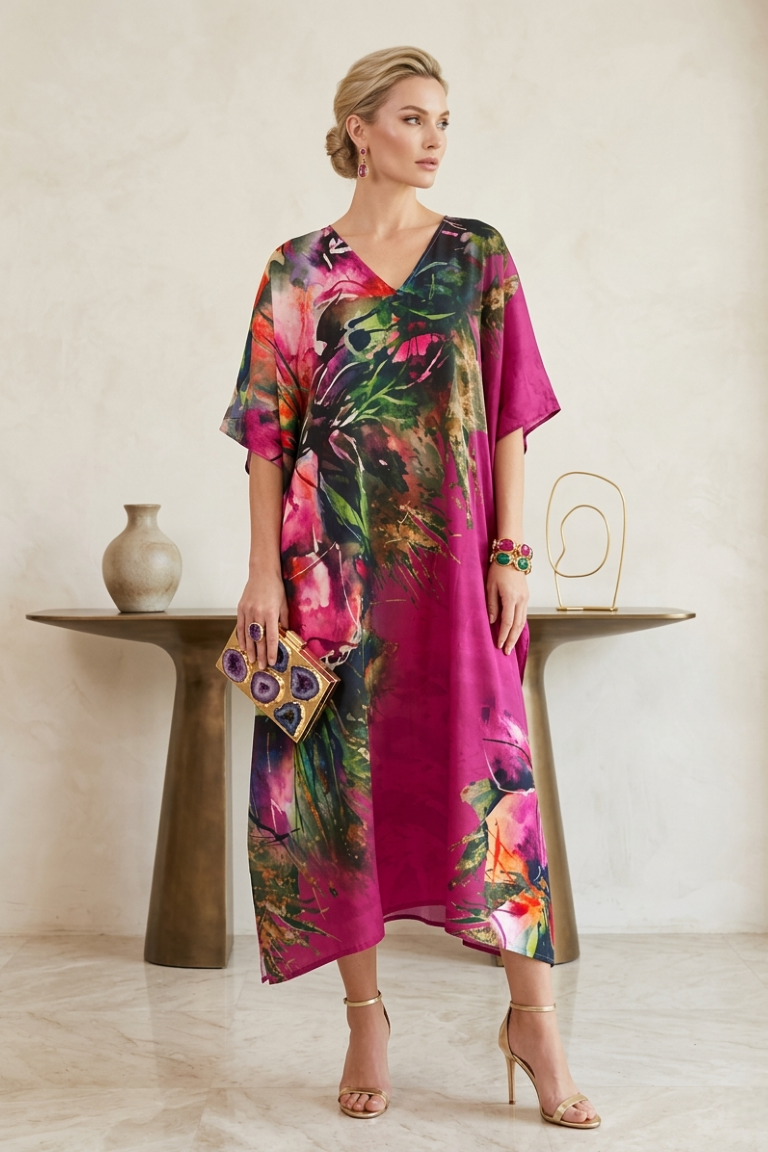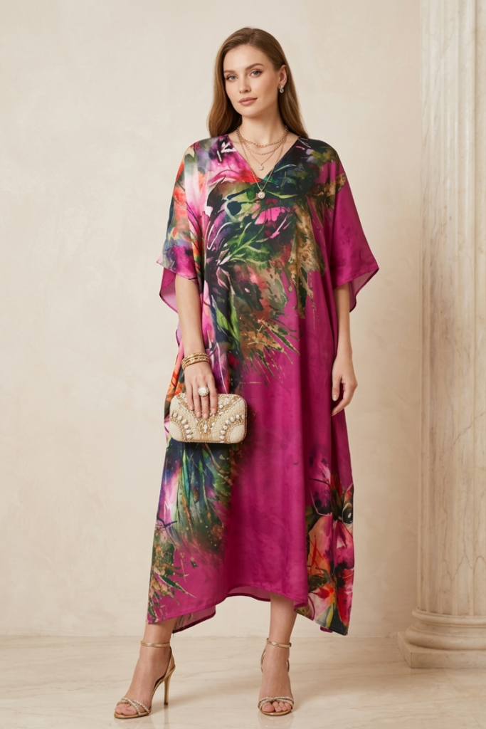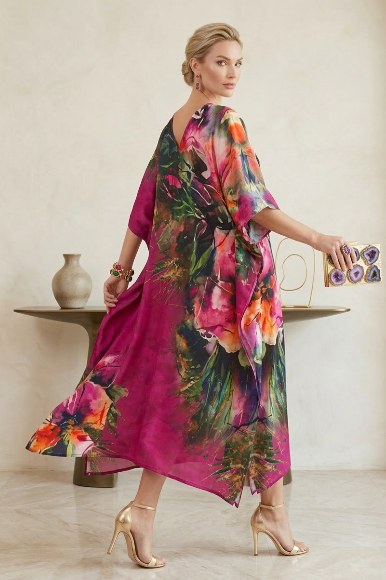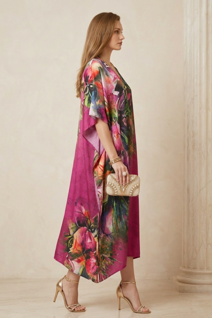 Bold. Artistic. Unforgettable. Our Wild Orchid Mirage Kaftan is where art meets fashion in full bloom. Set against a deep magenta canvas, this stunning piece features abstract florals in vivid strokes of orange, violet, and green—like a watercolor painting come to life. The flowy silhouette offers an effortless drape, making it your go-to for elegant lounging, seaside strolls, or chic brunches.