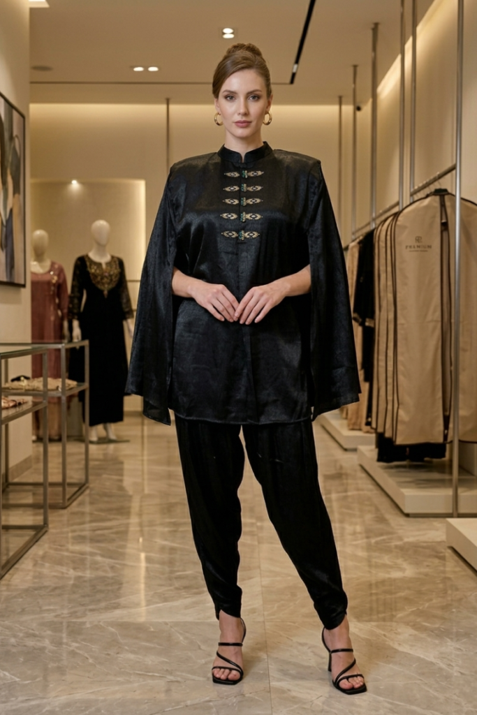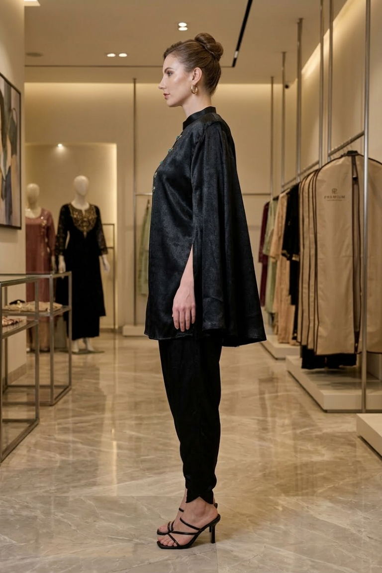 Elevate your evening wardrobe with the Zoya Cape set, 3 piece indo western ensemble designed for effortless elegance. Crafted in luxurious satin crepe fabric. This statement features a sleek inner top paired with tailored tulip pants and a dramatic cape style overlay that flows gracefully with every movement. The front neckline has gold and green embellishments adding a refined touch to its bold black palette. This set blends contemporary sophistication with timeless charm.